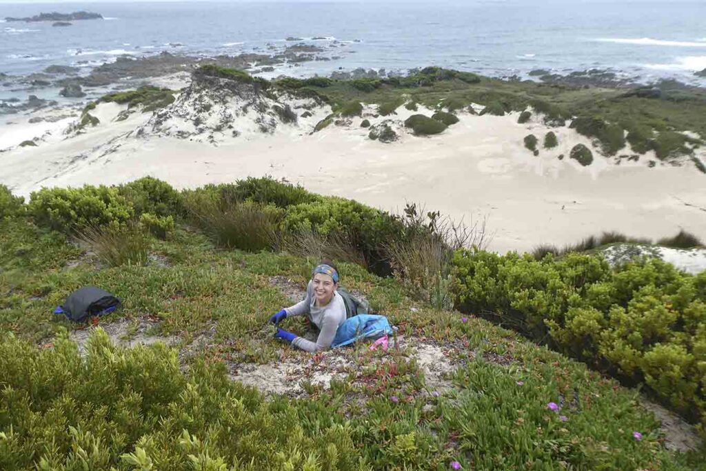 Mikayla pulling sea spurge from dune top pigface. Photo credit Andy Macqueen