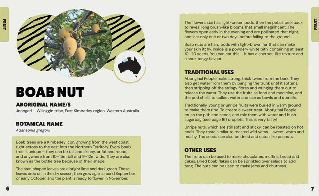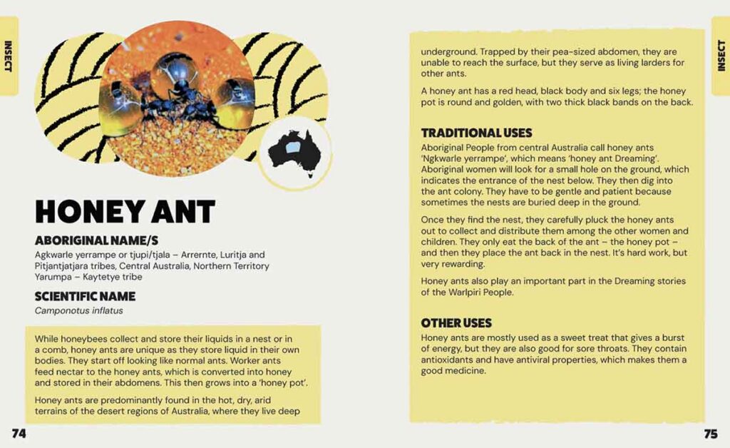 This book starts out providing an overview of indigenous culture and but in a book aimed at kids the front end of the book is a bit text heavy. Where kids and for that matter adults will really get into this book is is when the discussion of bush tukka starts. The book is broken into sections starting with plants, then animals which also includes insects and seafood, before moving onto proving some recipes which I wasn’t expecting.
