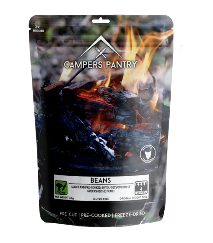 While I don’t mind eating bland and/or unhealthy food for the odd night or two, if I’m planning to do a 2-6 week trip I want to eat healthy and I also want variety. Also I’m happy to have a warm cooked meal at nighttime but the last thing that I want to do is get my stove out during the day so wraps, jerky, nut butters, or stove less meals, including vegetables, form an integral part of my lunches. I remember trawling online for dehydrated vegetables in 2016 when we first launched and having very little choice. Deb instant potato or dehydrated peas from the supermarkets, and three vegetable mix from the specialist stores has been the staple of the Australian camping set for a number of years. Not long after we came cross Campers Pantry who in addition to providing a range of freeze dried meals also offer a range of Freeze dried vegetables, including beans. While its rare these days that I eat a meal of just freeze dried vegetables I am happy to add something like these beans to a cold soak meal or add it to an other freeze dried meal to bulk it up.