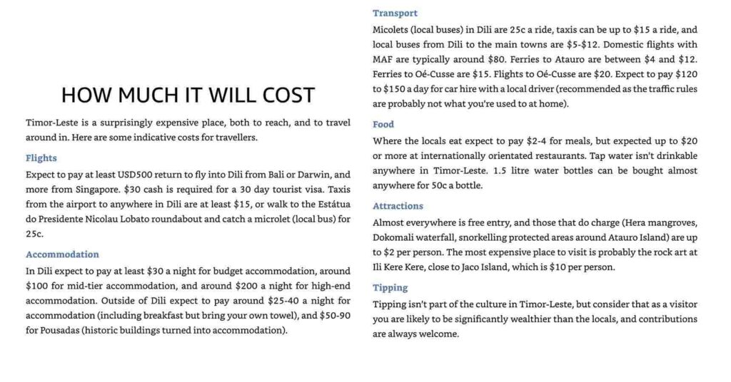 Timor Leste is one of those hidden locations that dues to its volatile recent past has really only started to get a reputation as a tourist destination and that brings with it a number of pluses and minus. As a new tourism destination you get to see a country that is still redeveloping and hasn’t gotten to the stage where everything becomes over commercialised. The downside is that this lack of commercialisation can often make it harder to find all those little details that information driven types like myself want to know before you arrive.