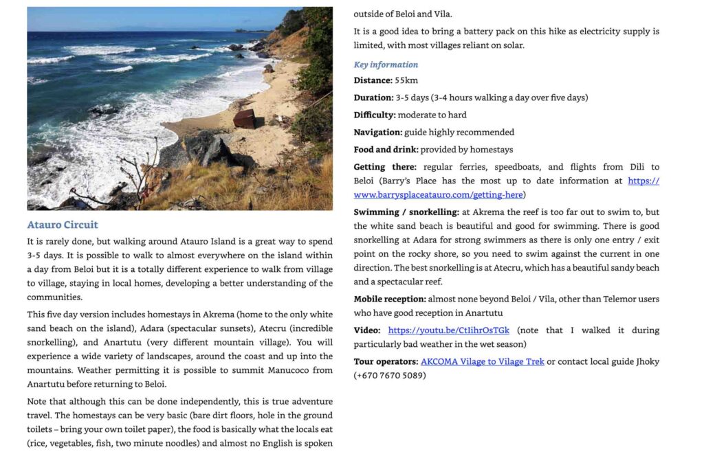 What amazed me was the amount of detail for just about any activity you could think of including transport, eateries, and other activities. It really was much more than I expected. The downside concerned the hikes. The information concerning each hike provided enough overview to allow readers to decide if this was something that would be of interest and there was plenty of choice across the various regions of the country. Some of the hikes had a reasonable amount of information whole others contained less than I personally would have likes. Having said that the hikes that were ‘self guided’ provided enough information to get you there and on this hikes were guiding was recommended there was also enough information to identify who can help you out. I’m just one of these people that likes a lot of detail. Given that this book in its kindle edition is 175 pages long it provides a lot of details about visiting Timor Leste so helps set you up. Just don’t expect to go wandering through the more serious hikes without some help, the country hasn’t set up the trail signage for this sort of hike yet.