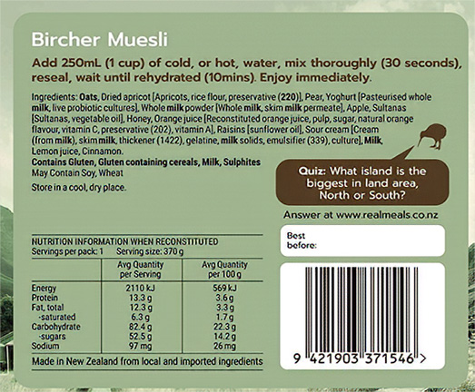 Real Meals Bircher Muesli nutrition and ingredient panel