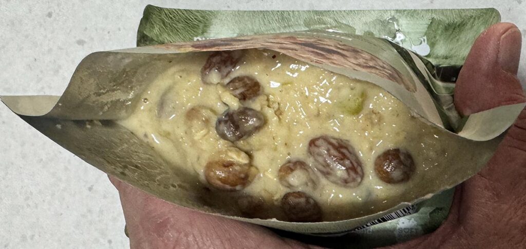 Real Meals Bircher Muesli bag torn down to form a bowl and ready to eat. If you use a long handled utensil, you won’t need to cut or tear the bag down