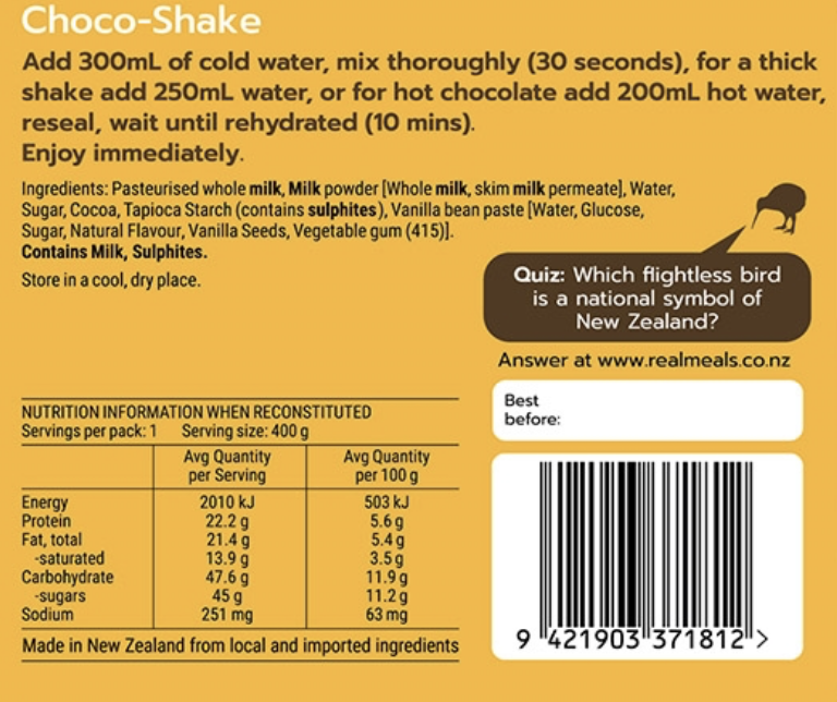 Real Meals Choco-Shake Nutrition and Ingredient panel