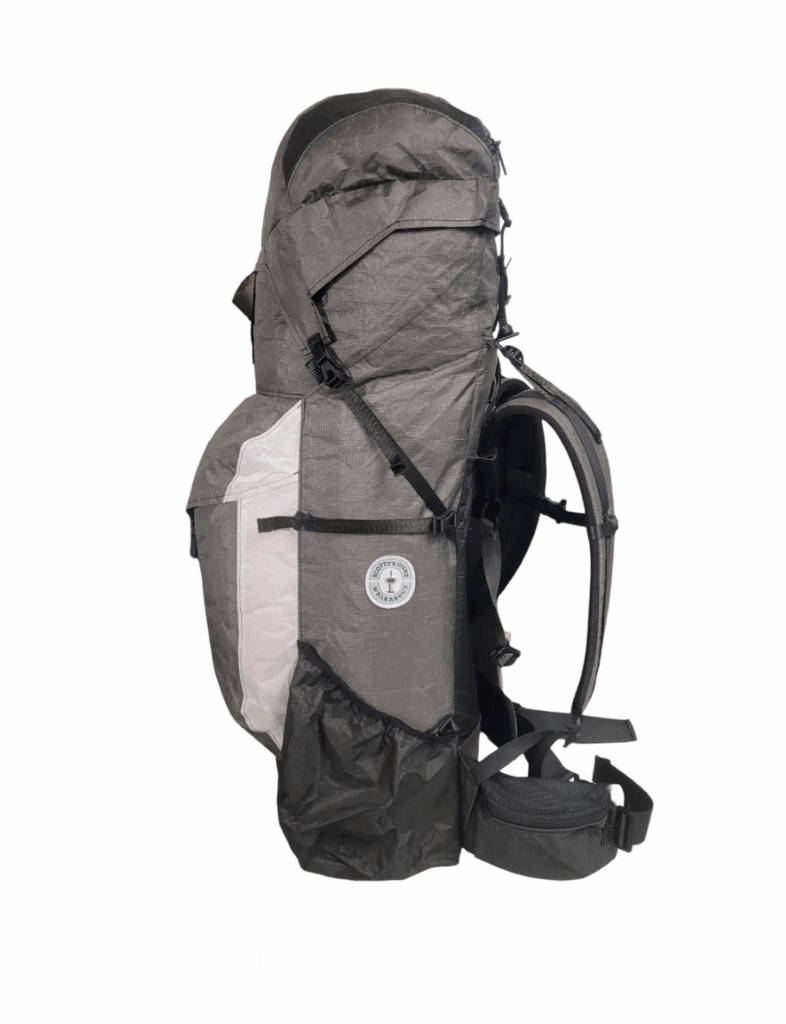 Whippa X Scotty’s Gone Walkabout Colo 55 Ultralight Hiking Pack pockets side view including hip belt pocket and water bottle pocket