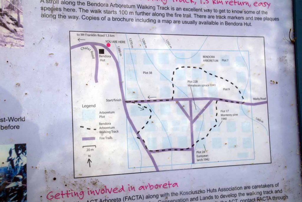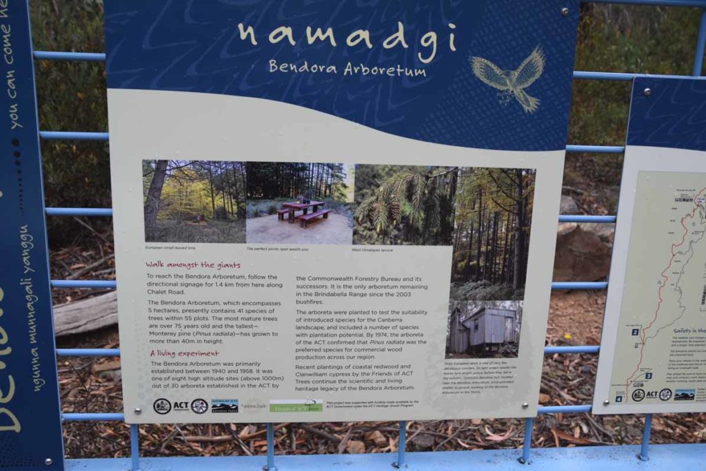 Once you reach Bendora Hut have a look around before you head down the steps and turn right down the road. The main directional signage at the Arboretum is confusing. Follow the small arrows instead once you enter the arboretum proper