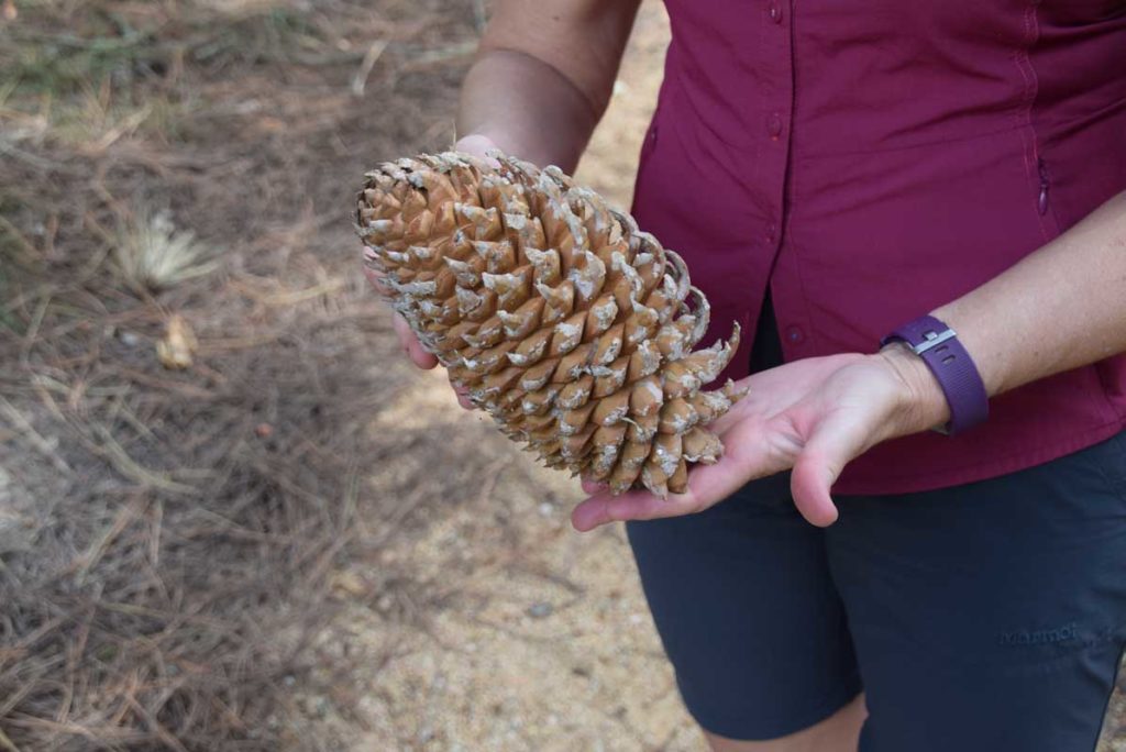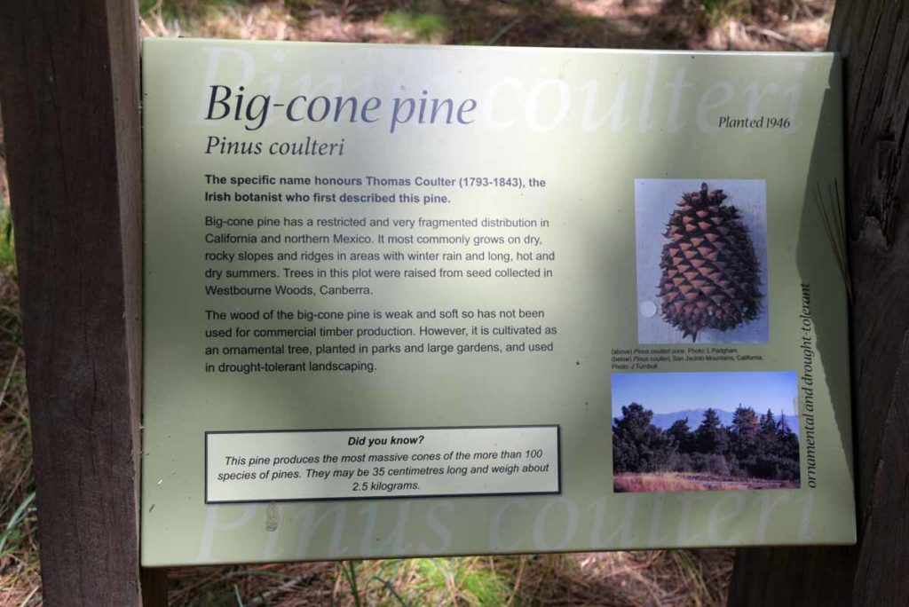 Pinus coulteri – big cone pine. This sign is typical of the many descriptive signs throughout the arboretum