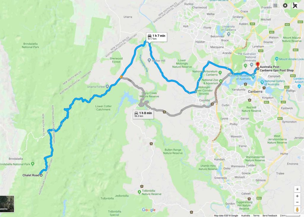 The Bendora Arboretum Google map showing the distance from the Canberra GPO to the trail head car park on Mt Franklin Road: