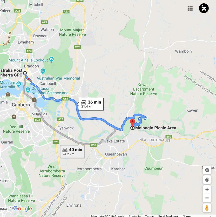 Google map showing the distance from the Canberra GPO to the trail head. This walk is only 22 km from the Canberra GPO and will take around 30 minutes to reach from the city centre