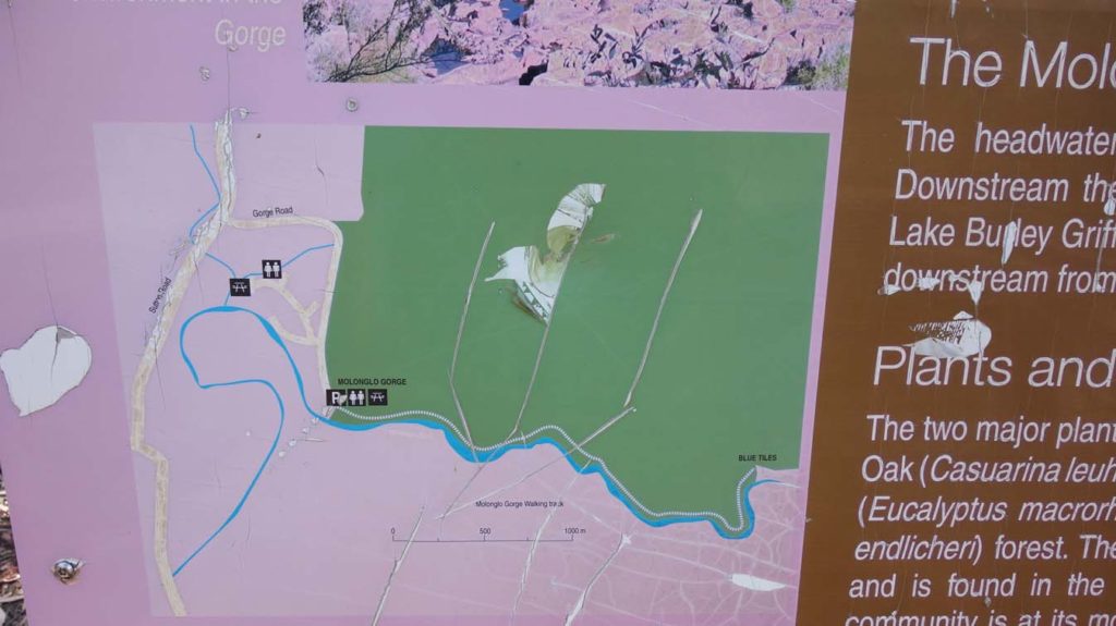 This trail follows the Gorge with the destination being the Blue Tiles picnic area at about 3.4 km. The Blue Tiles picnic area contains picnic tables and while there is a water tank it is not in use so come prepared with your own water or bring a filter to drink from the river. This would be a good area for swimming on hot days so if you are that way inclined come prepared.