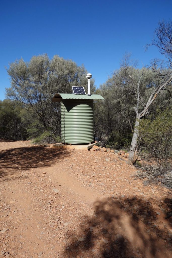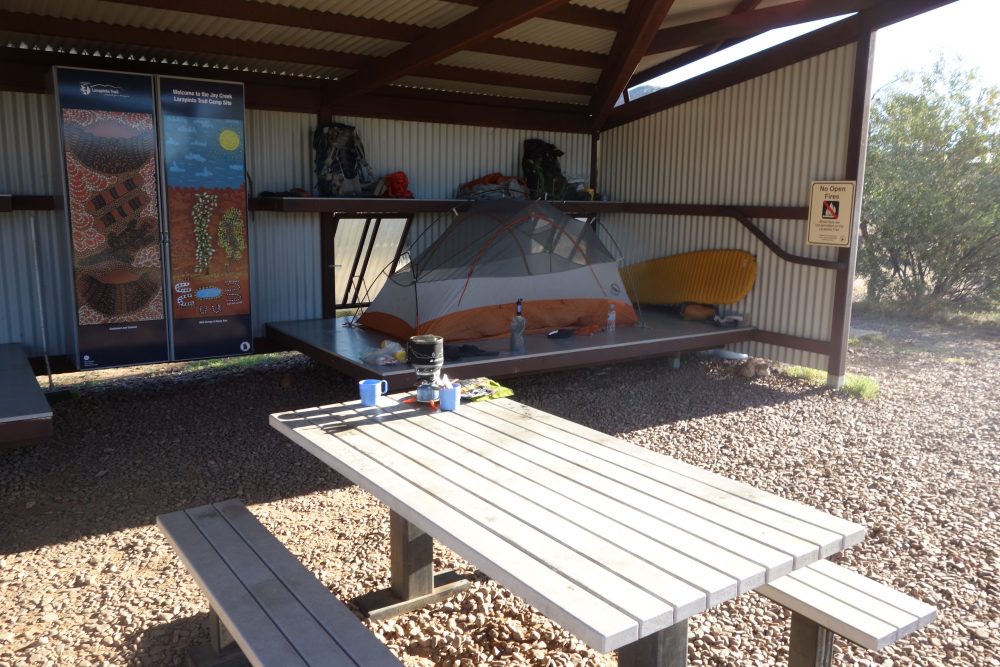 Typical shelter found at a number of Larapinta section trail heads. We tried out our freestanding tent on the camping platform on this night at Jay Creek