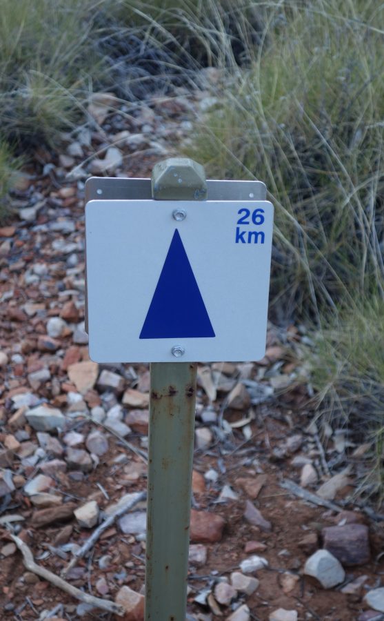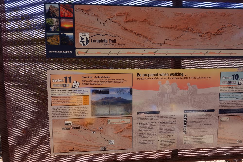 The Larapinta Trail is designed to start in Alice Springs and finish at Mt Sonder and as such the difficulty ratings attached to each of the 12 sections in the printed brochures and the guidebooks are based on this. But there were discrepancies between the various sources. We found that doing the trip in ’reverse’ meant that the difficulty rating provided in the section pamphlets by the local parks authority indicates that the hardest sections are section 4 (Standley Chasm to Birthday Waterhole) and Section 5 (Birthday Waterhole to Hugh Gorge). The trail head signs have been updated and vary from the brochures. While both these sections were hard we found that in doing the trip in reverse, and altering the ups and downs, that Section 3 (Standley Chasm to Jay Creek), and Section 9 (Ormiston Gorge to Serpentine Chalet Dam) were now the most difficult sections. This was not just our opinion but also that of those we talked to travelling the same direction as us.