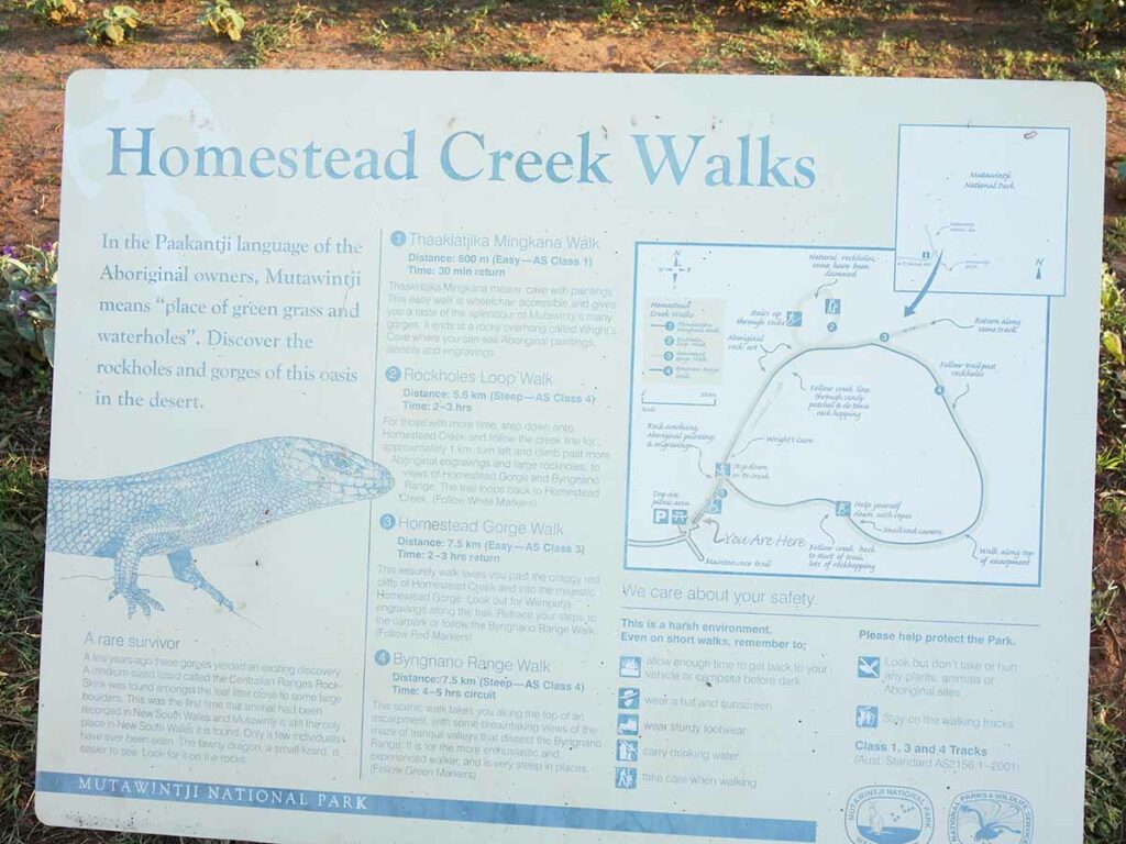 Thaaklatjika Mingkana Walking Track trailhead signage. Our GPS measured this track as a bit longer than the signage states as we started from the campground rather than the day use area