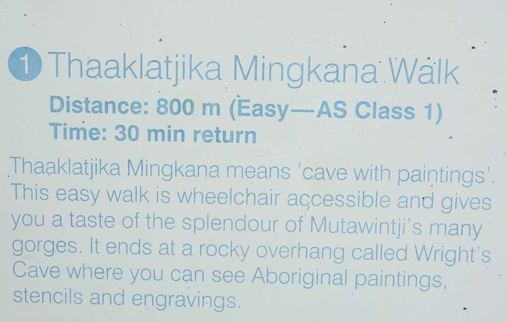 The out and back Thaaklatjika Mingkana Walking Track is the shortest of all the walks at around 2.6 km if started from the campground or around 1km shorter if you start from the day use area. This walk can be done as a standalone walk and while not an overly long, will suit many non hikers with the reward being a designated rock art gallery at the mid point. The other bonus of this walk is that its wheelchair friendly, the only one in this park.